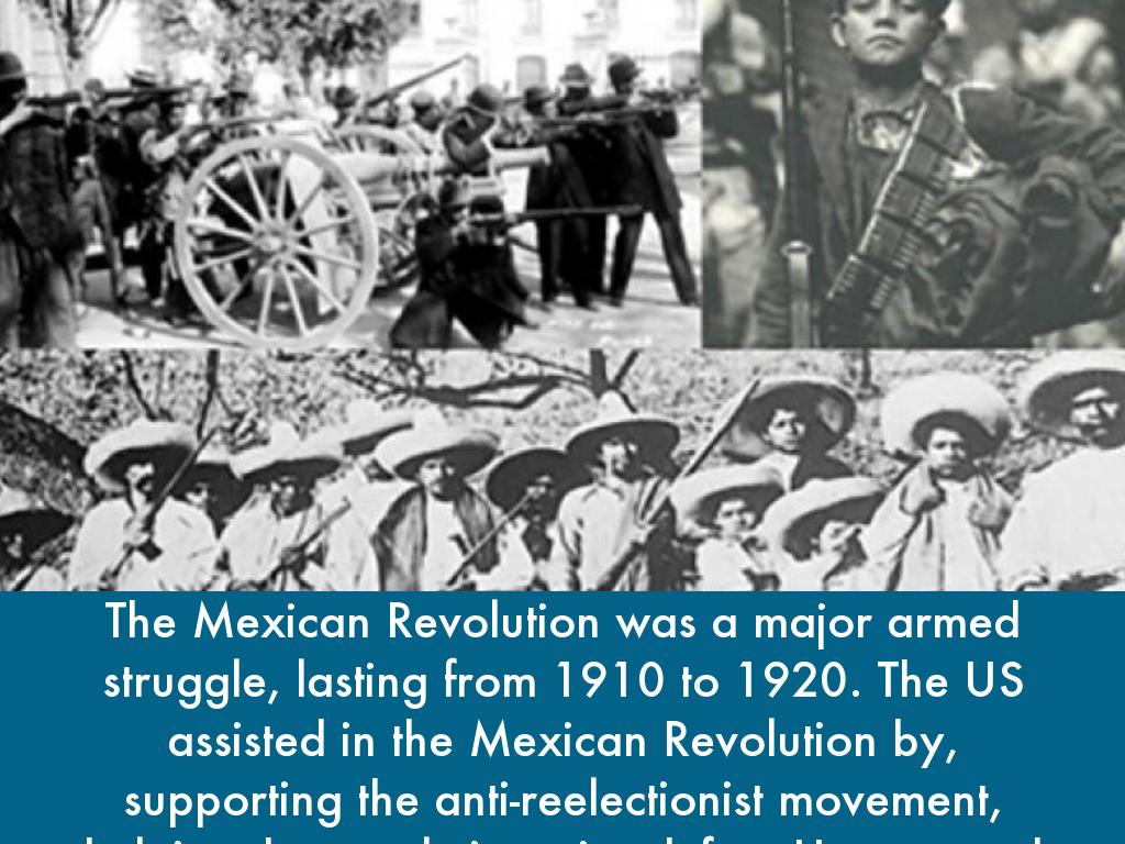 The Mexican Revolution was a major armed struggle, lasting from 1910 to 1920. The US assisted in the Mexican Revolution by, supporting the anti-reelectionist movement, helping the revolutionaries defeat Huerta, and invaded Veracruz in 1914.