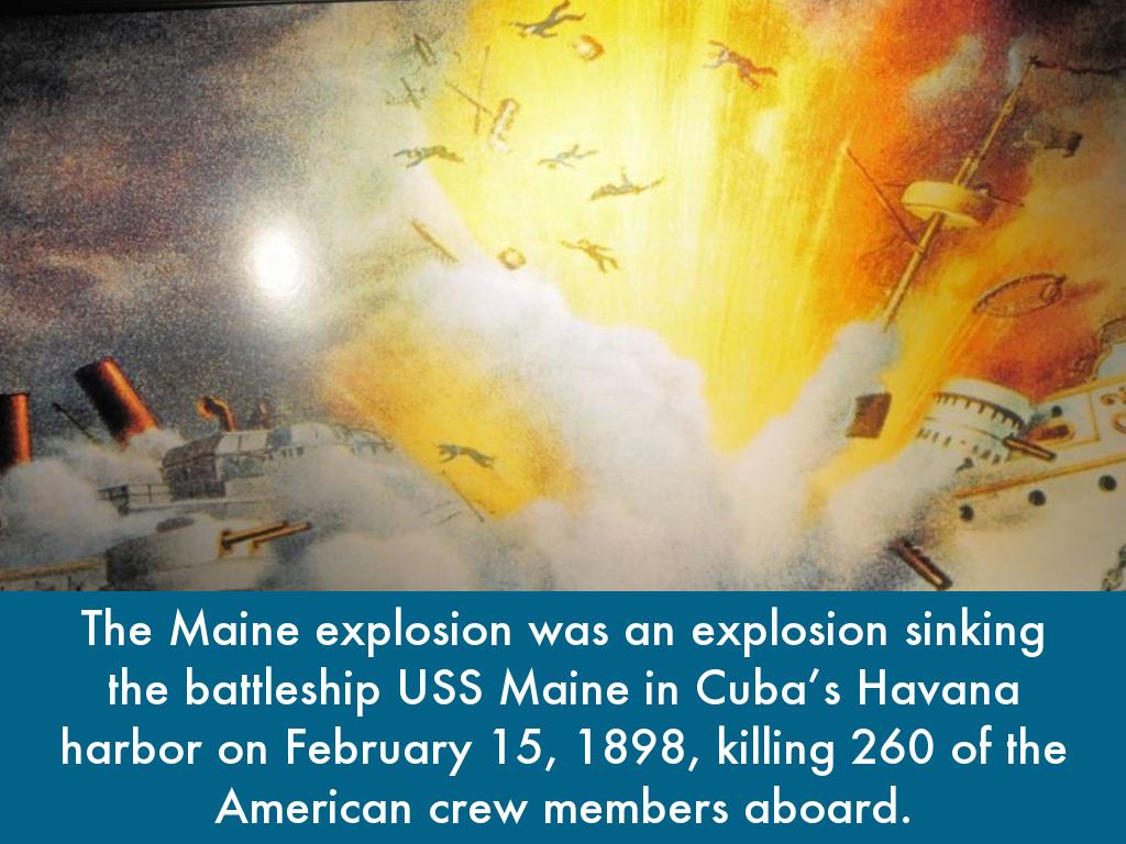 The Maine explosion was an explosion sinking the battleship USS Maine in Cuba’s Havana harbor on February 15, 1898, killing 260 of the American crew members aboard.