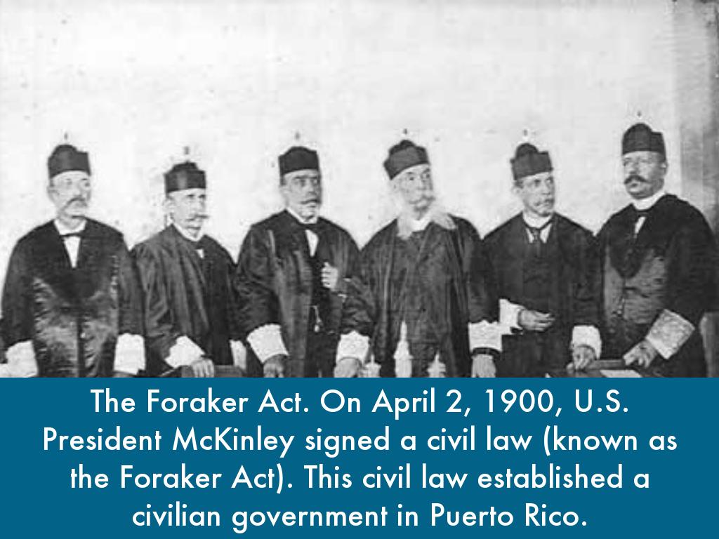 The Foraker Act. On April 2, 1900, U.S. President McKinley signed a civil law (known as the Foraker Act). This civil law established a civilian government in Puerto Rico.