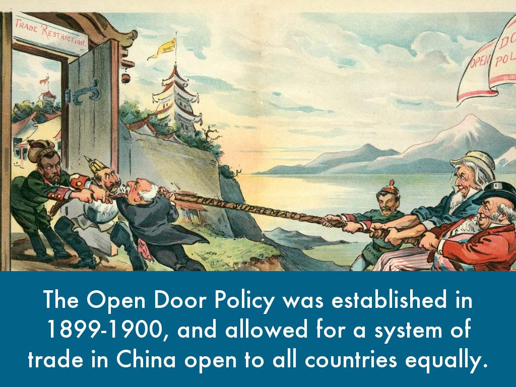 The Open Door Policy was established in 1899-1900, and allowed for a system of trade in China open to all countries equally.
