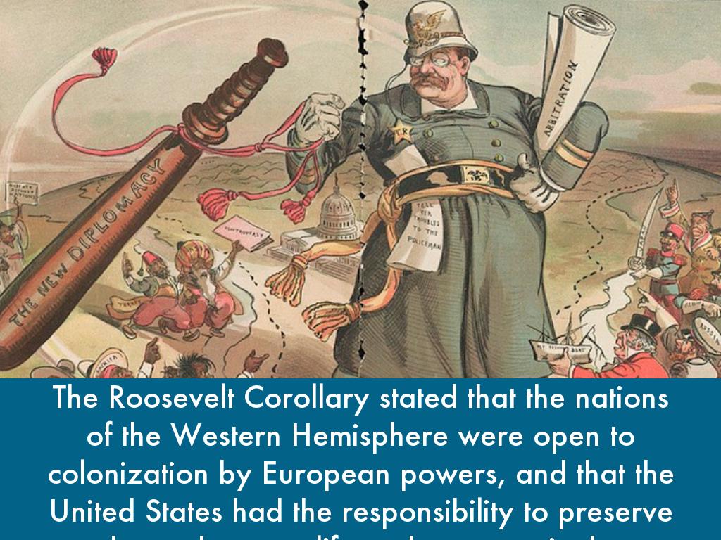 The Roosevelt Corollary stated that the nations of the Western Hemisphere were open to colonization by European powers, and that the United States had the responsibility to preserve order and protect life and property in those countries.