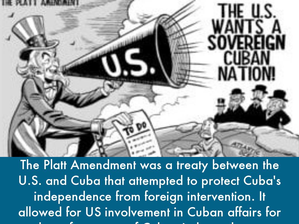 The Platt Amendment was a treaty between the U.S. and Cuba that attempted to protect Cuba's independence from foreign intervention. It allowed for US involvement in Cuban affairs for the enforcement of Cuban independence.