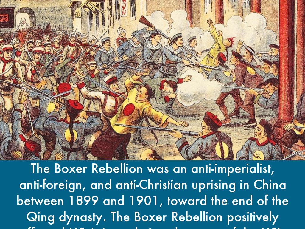 The Boxer Rebellion was an anti-imperialist, anti-foreign, and anti-Christian uprising in China between 1899 and 1901, toward the end of the Qing dynasty. The Boxer Rebellion positively affected US-Asian relations because of the US's suppression of it. rebellion