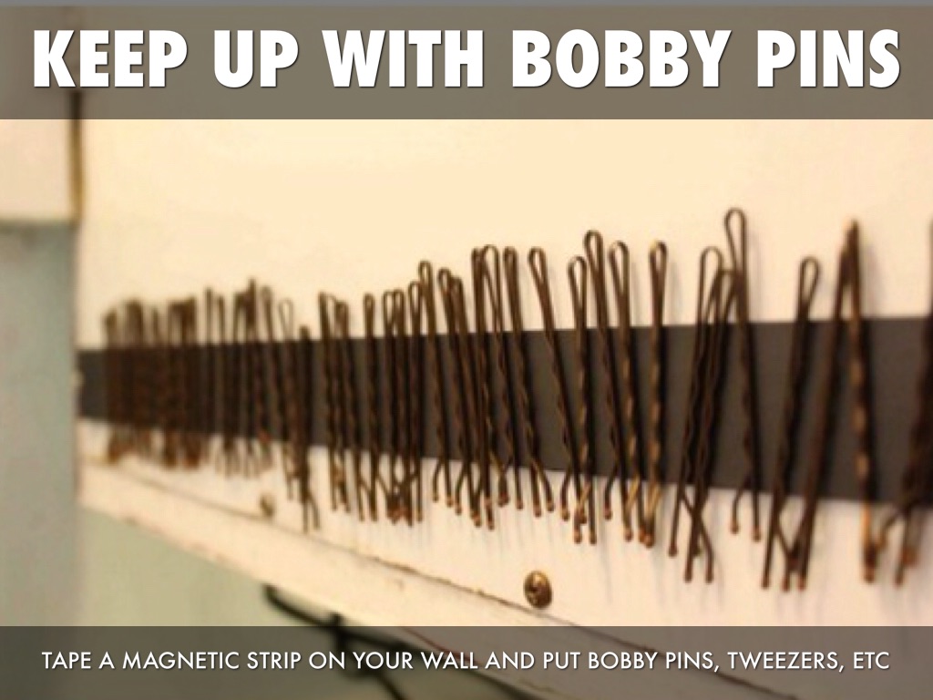 TAPE A MAGNETIC STRIP ON YOUR WALL AND PUT BOBBY PINS, TWEEZERS, ETC