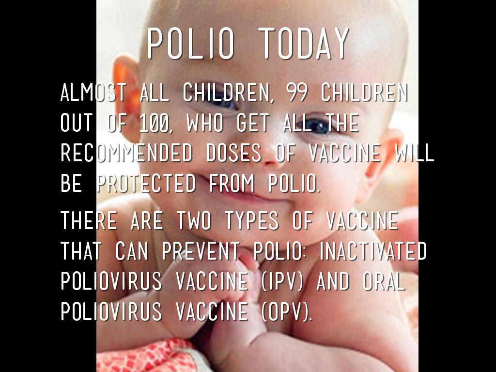 There are two types of vaccine that can prevent polio: inactivated poliovirus vaccine (IPV) and oral poliovirus vaccine (OPV).