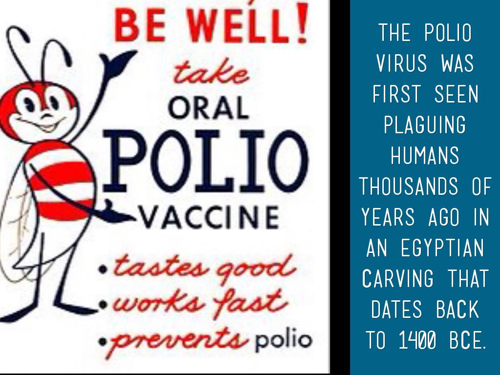 The Polio Virus was first seen plaguing humans thousands of years ago in an Egyptian carving that dates back to 1400 BCE.