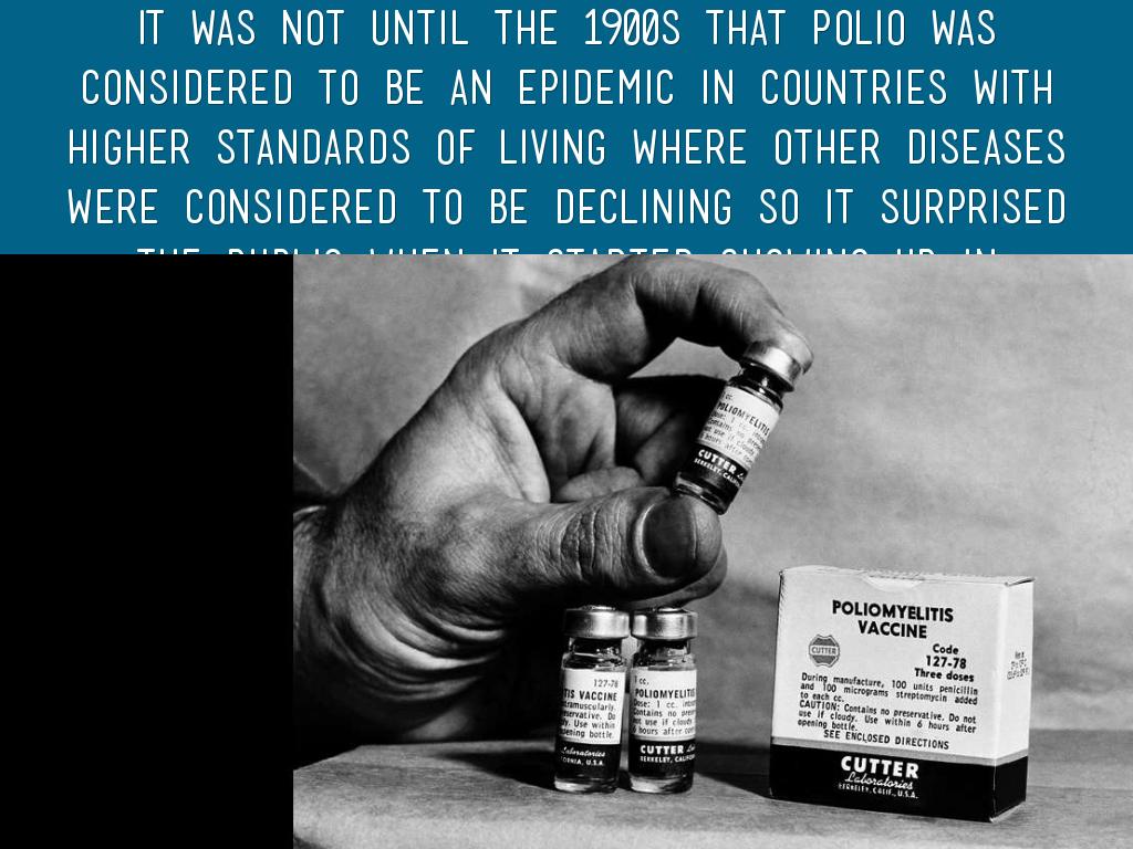 It was not until the 1900s that polio was considered to be an epidemic in countries with higher standards of living where other diseases were considered to be declining so it surprised the public when it started showing up in newborn children.