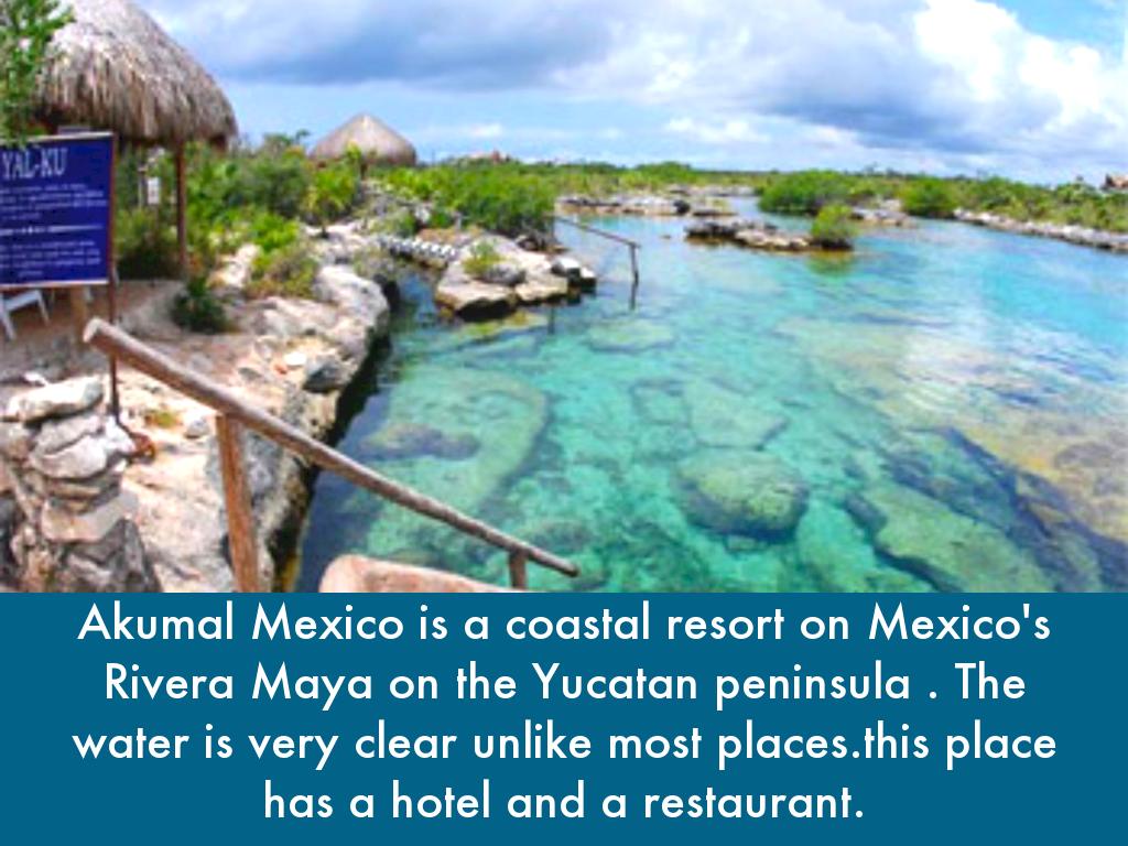 Akumal Mexico is a coastal resort on Mexico's Rivera Maya on the Yucatan peninsula . The water is very clear unlike most places.this place has a hotel and a restaurant.