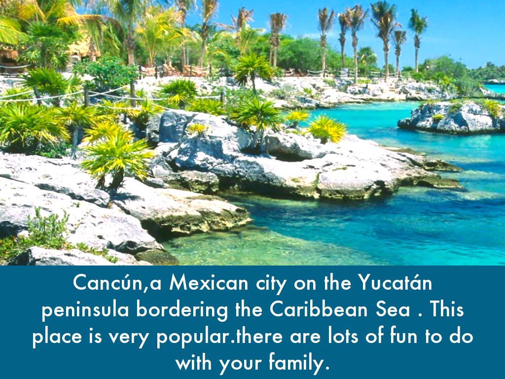 Cancún,a Mexican city on the Yucatán peninsula bordering the Caribbean Sea . This place is very popular.there are lots of fun to do with your family.