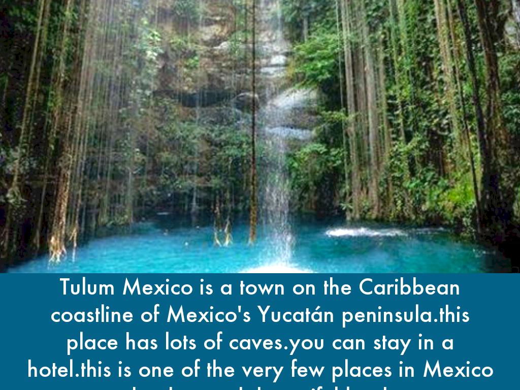 Tulum Mexico is a town on the Caribbean coastline of Mexico's Yucatán peninsula.this place has lots of caves.you can stay in a hotel.this is one of the very few places in Mexico that has such beautiful land.