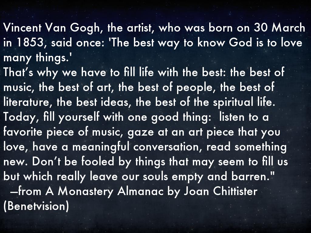 Vincent Van Gogh, the artist, who was born on 30 March in 1853, said once: 'The best way to know God is to love many things.' That’s why we have to fill life with the best: the best of music, the best of art, the best of people, the best of literature, the best ideas, the best of the spiritual life. Today, fill yourself with one good thing: listen to a favorite piece of music, gaze at an art piece that you love, have a meaningful conversation, read something new. Don’t be fooled by things that may seem to fill us but which really leave our souls empty and barren." —from A Monastery Almanac by Joan Chittister (Benetvision)