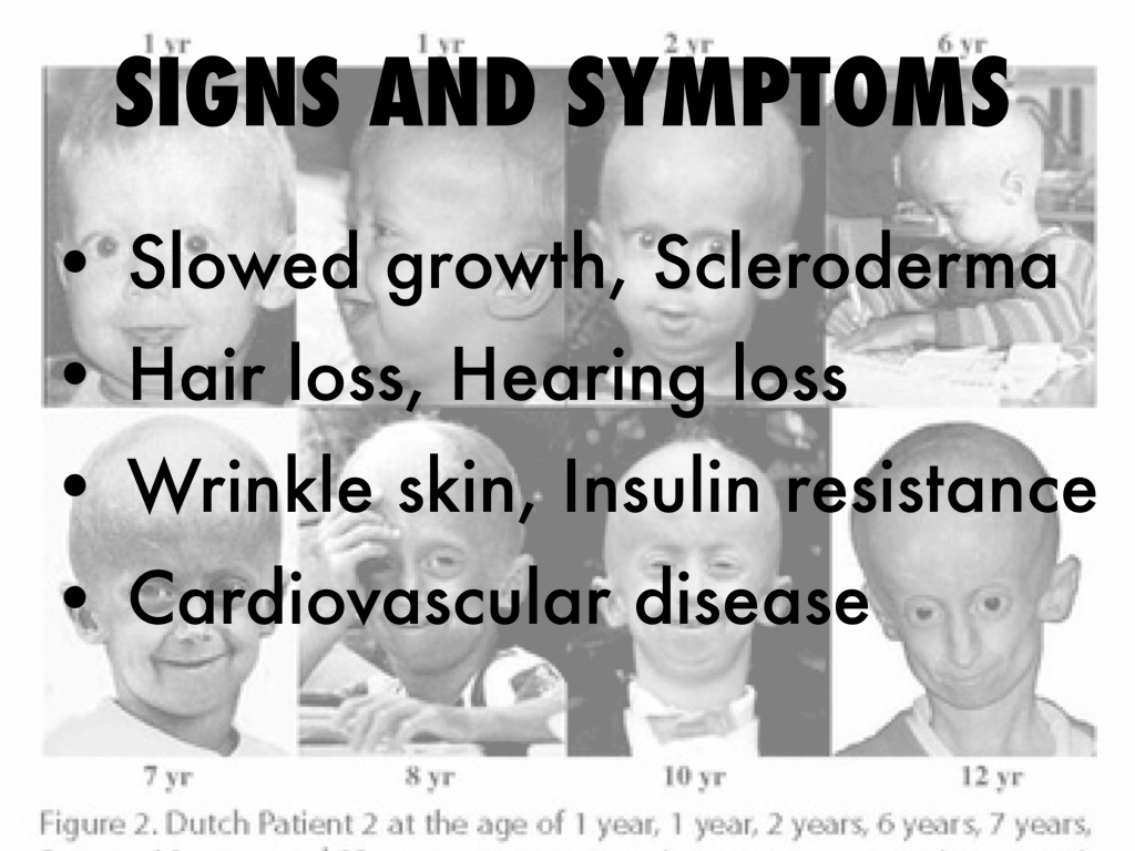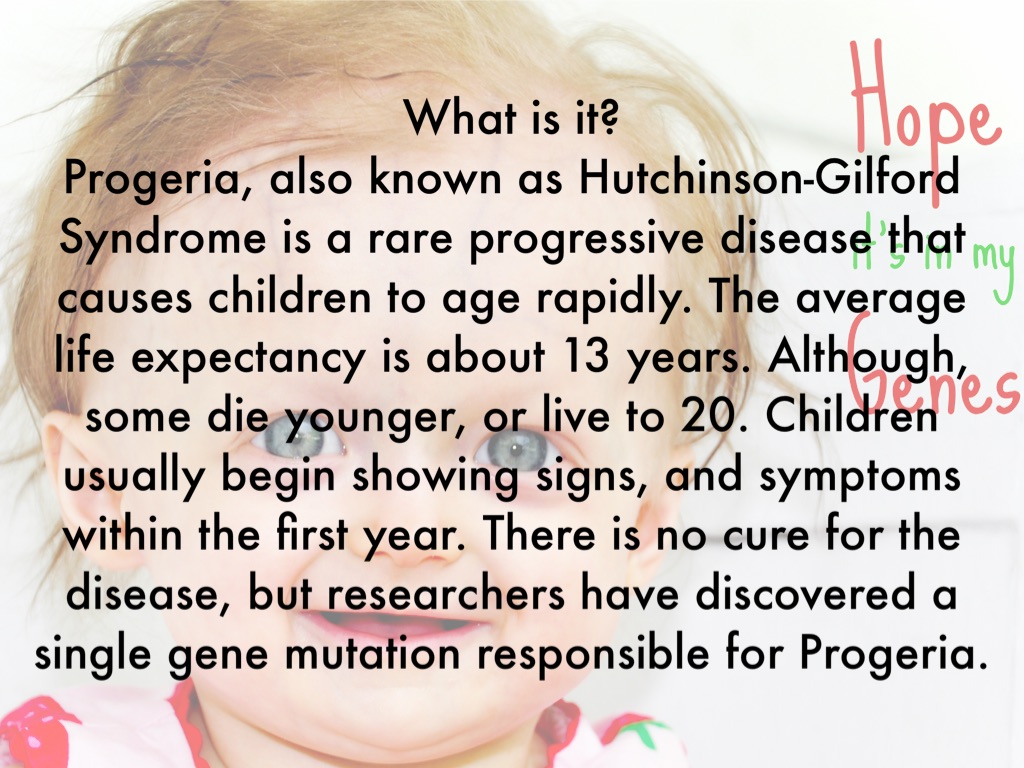 Progeria, also known as Hutchinson-Gilford Syndrome is a rare progressive disease that causes children to age rapidly. The average life expectancy is about 13 years. Although, some die younger, or live to 20. Children usually begin showing signs, and symptoms within the first year. There is no cure for the disease, but researchers have discovered a single gene mutation responsible for Progeria.