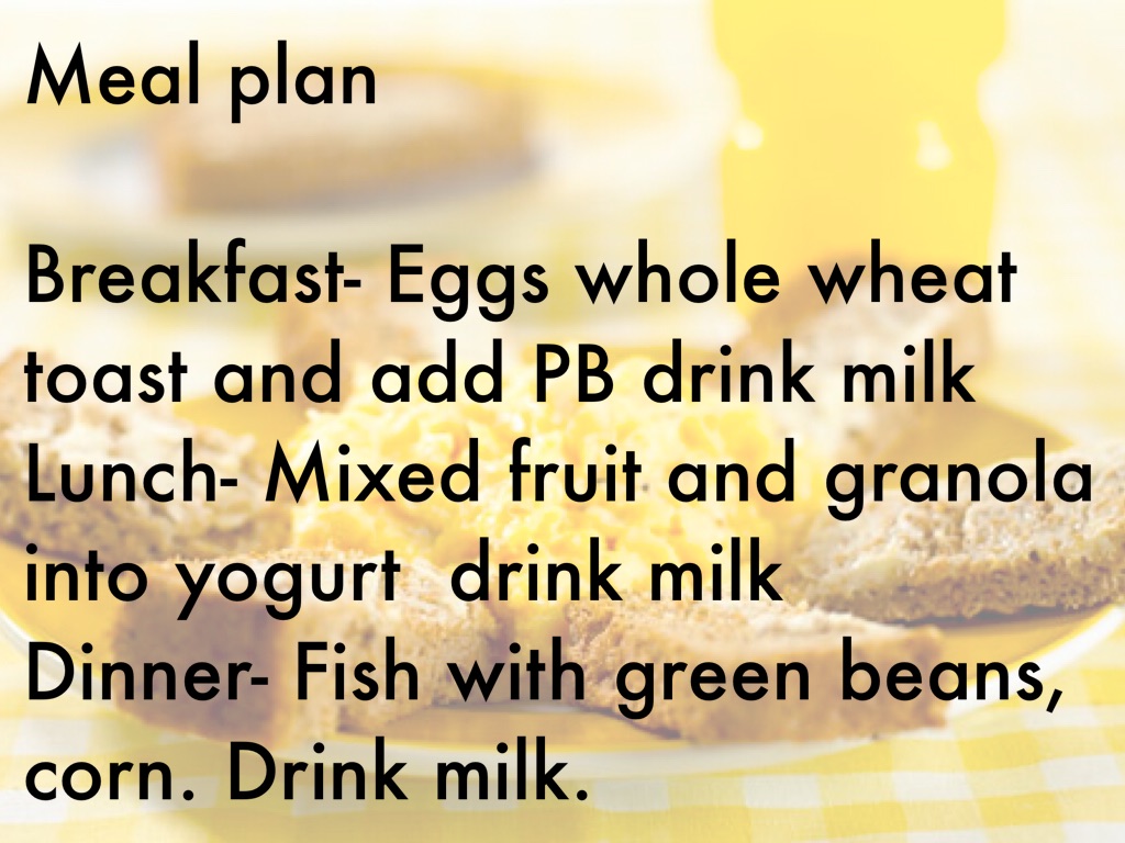 Breakfast- Eggs whole wheat toast and add PB drink milk