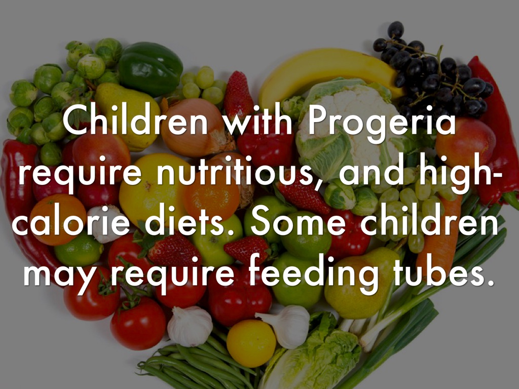 Children with Progeria require nutritious, and high- calorie diets. Some children may require feeding tubes.
