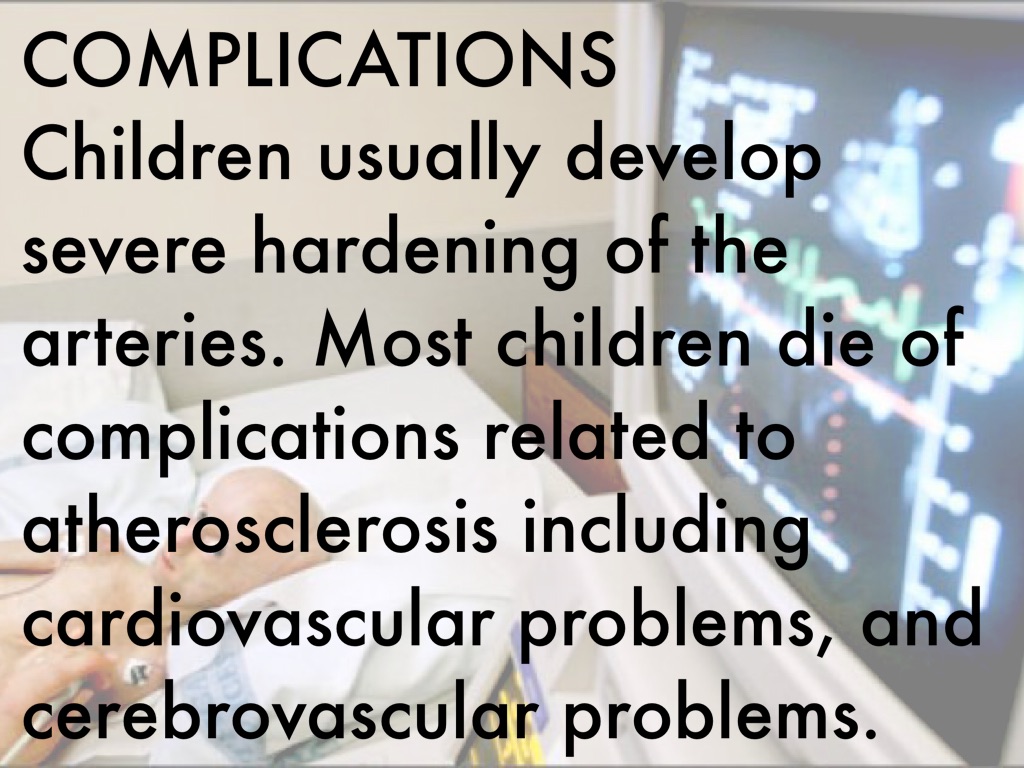 Children usually develop severe hardening of the arteries. Most children die of complications related to atherosclerosis including cardiovascular problems, and cerebrovascular problems.