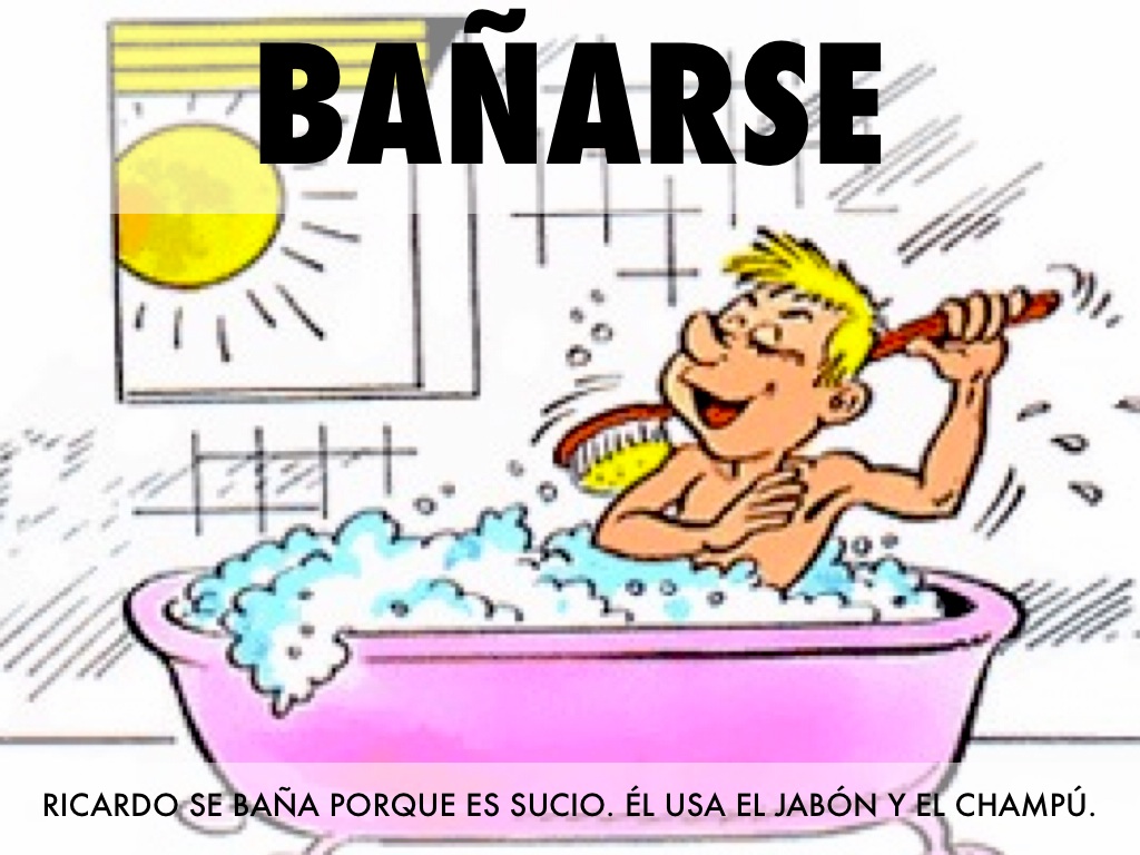 RICARDO SE BAÑA PORQUE ES SUCIO. ÉL USA EL JABÓN Y EL CHAMPÚ.