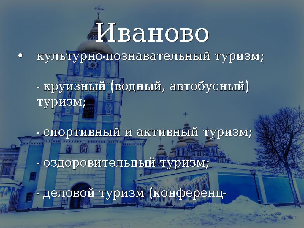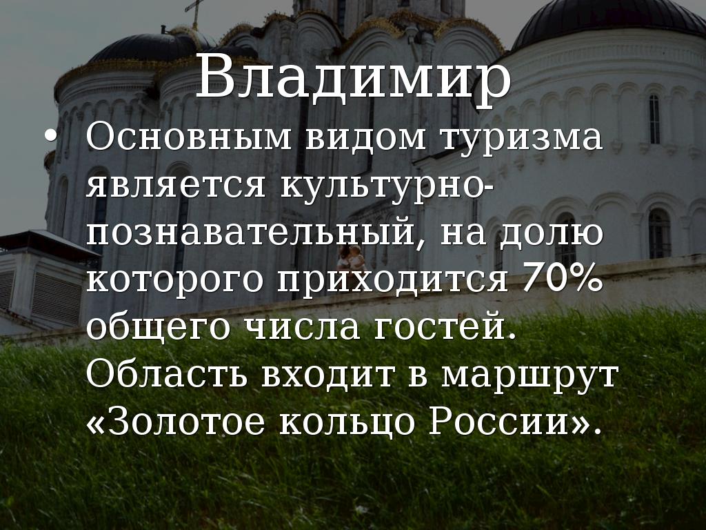 Основным видом туризма является культурно-познавательный, на долю которого приходится 70% общего числа гостей. Область входит в маршрут «Золотое кольцо России».