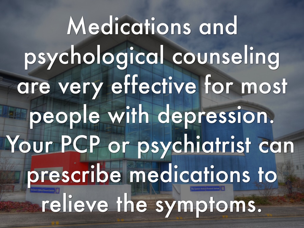 Medications and psychological counseling are very effective for most people with depression. Your PCP or psychiatrist can prescribe medications to relieve the symptoms.