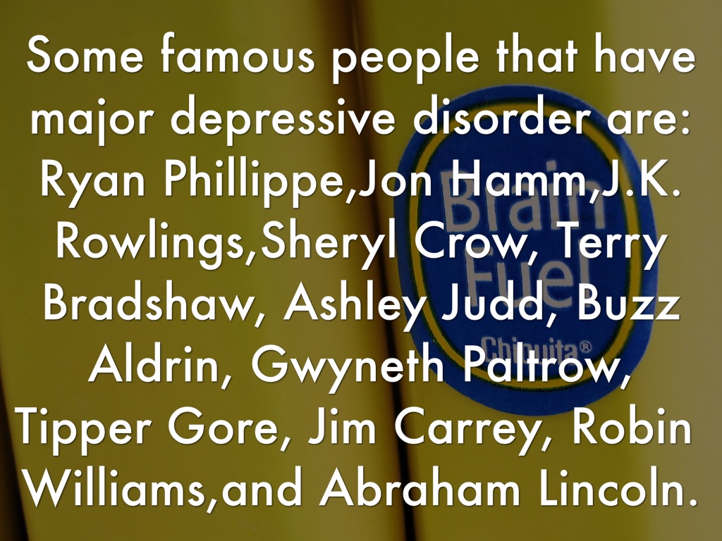 Some famous people that have major depressive disorder are: Ryan Phillippe,Jon Hamm,J.K. Rowlings,Sheryl Crow, Terry Bradshaw, Ashley Judd, Buzz Aldrin, Gwyneth Paltrow, Tipper Gore, Jim Carrey, Robin Williams,and Abraham Lincoln.