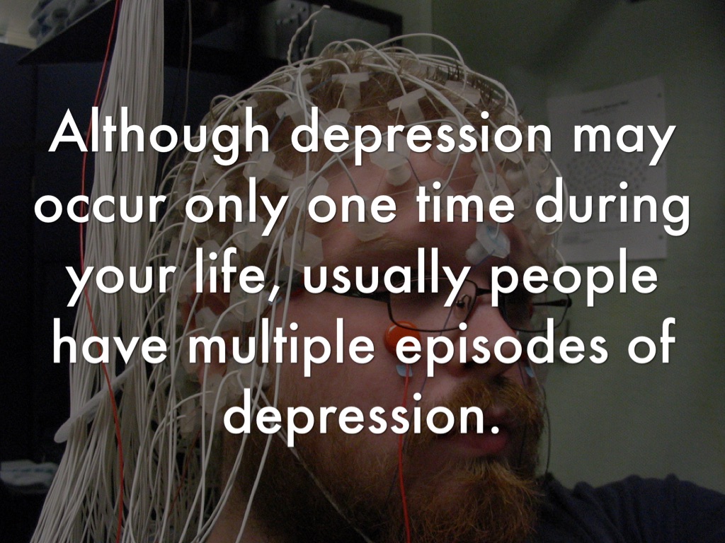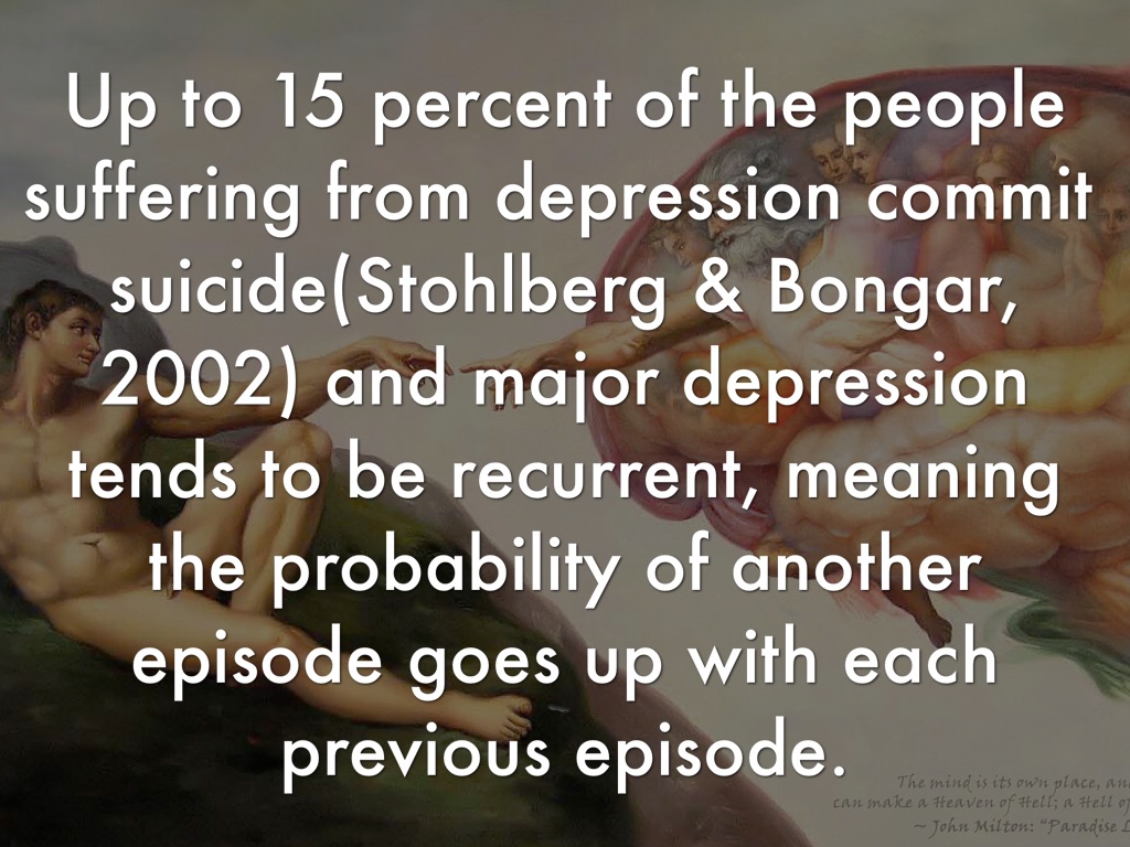 Up to 15 percent of the people suffering from depression commit suicide(Stohlberg & Bongar,2002) and major depression tends to be recurrent, meaning the probability of another episode goes up with each previous episode.