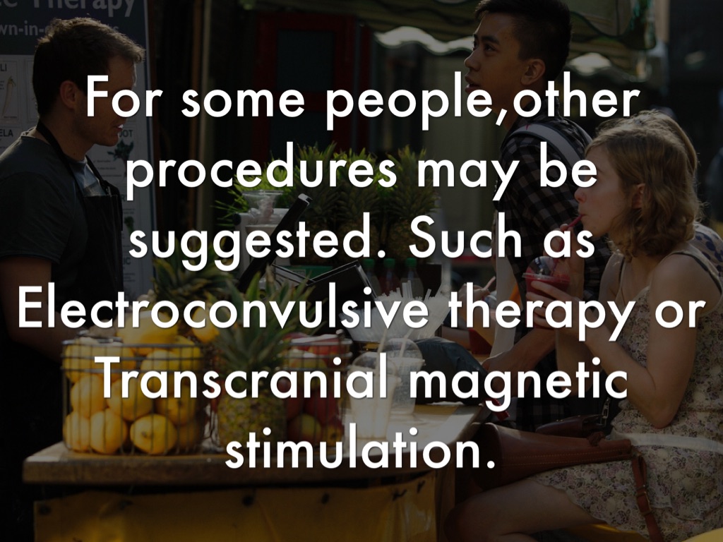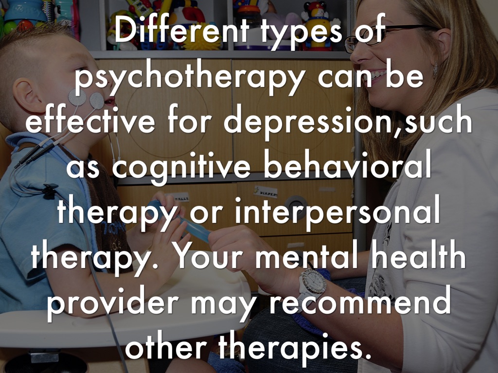 Different types of psychotherapy can be effective for depression,such as cognitive behavioral therapy or interpersonal therapy. Your mental health provider may recommend other therapies.