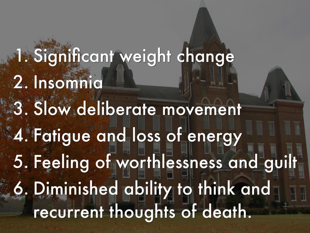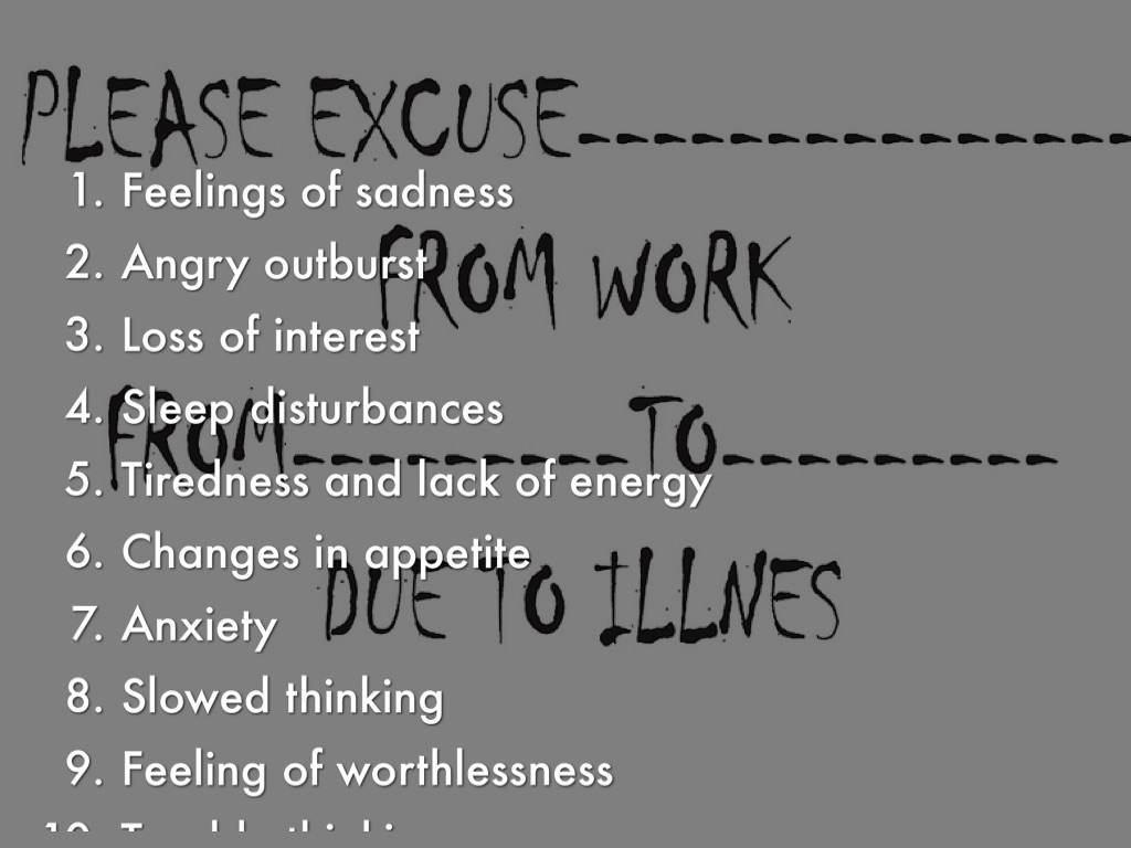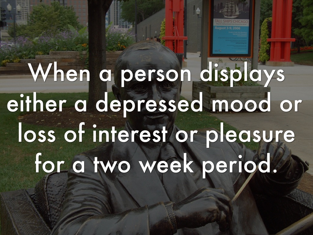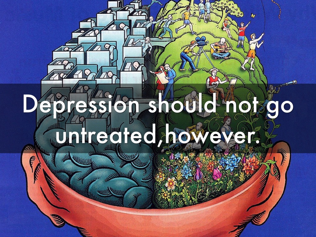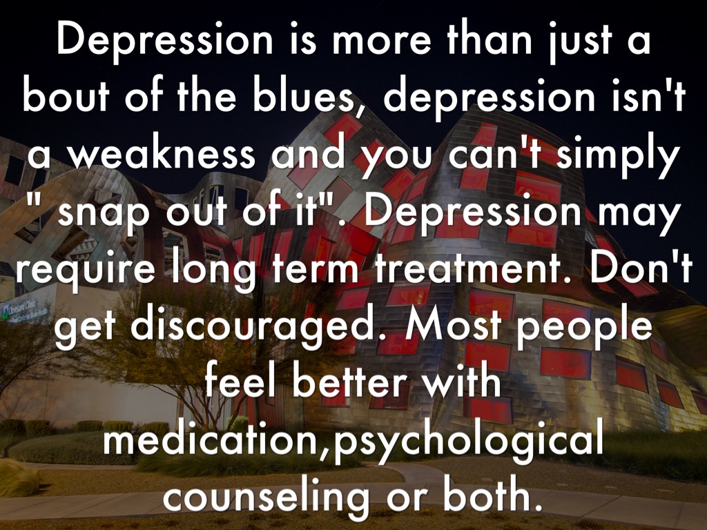 Depression is more than just a bout of the blues, depression isn't a weakness and you can't simply " snap out of it". Depression may require long term treatment. Don't get discouraged. Most people feel better with medication,psychological counseling or both.