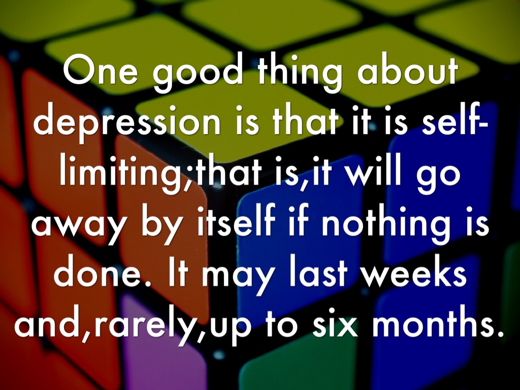 One good thing about depression is that it is self-limiting;that is,it will go away by itself if nothing is done. It may last weeks and,rarely,up to six months.