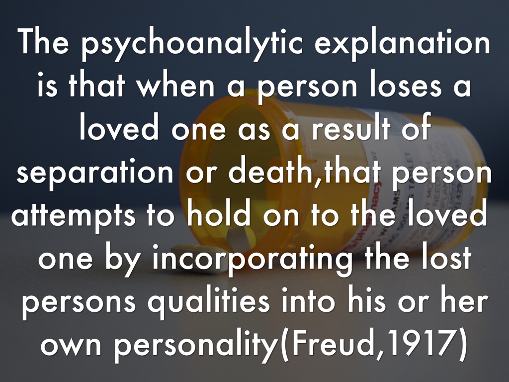 The psychoanalytic explanation is that when a person loses a loved one as a result of separation or death,that person attempts to hold on to the loved one by incorporating the lost persons qualities into his or her own personality(Freud,1917)