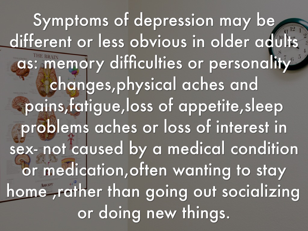 Symptoms of depression may be different or less obvious in older adults as: memory difficulties or personality changes,physical aches and pains,fatigue,loss of appetite,sleep problems aches or loss of interest in sex- not caused by a medical condition or medication,often wanting to stay home ,rather than going out socializing or doing new things.