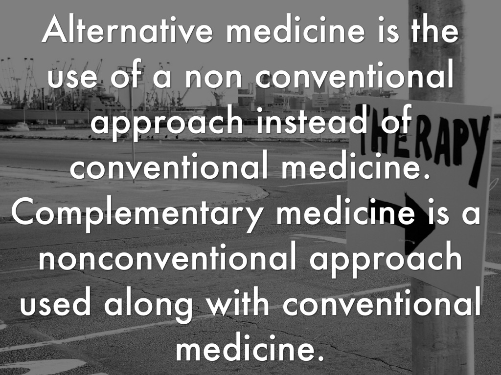 Alternative medicine is the use of a non conventional approach instead of conventional medicine. Complementary medicine is a nonconventional approach used along with conventional medicine.