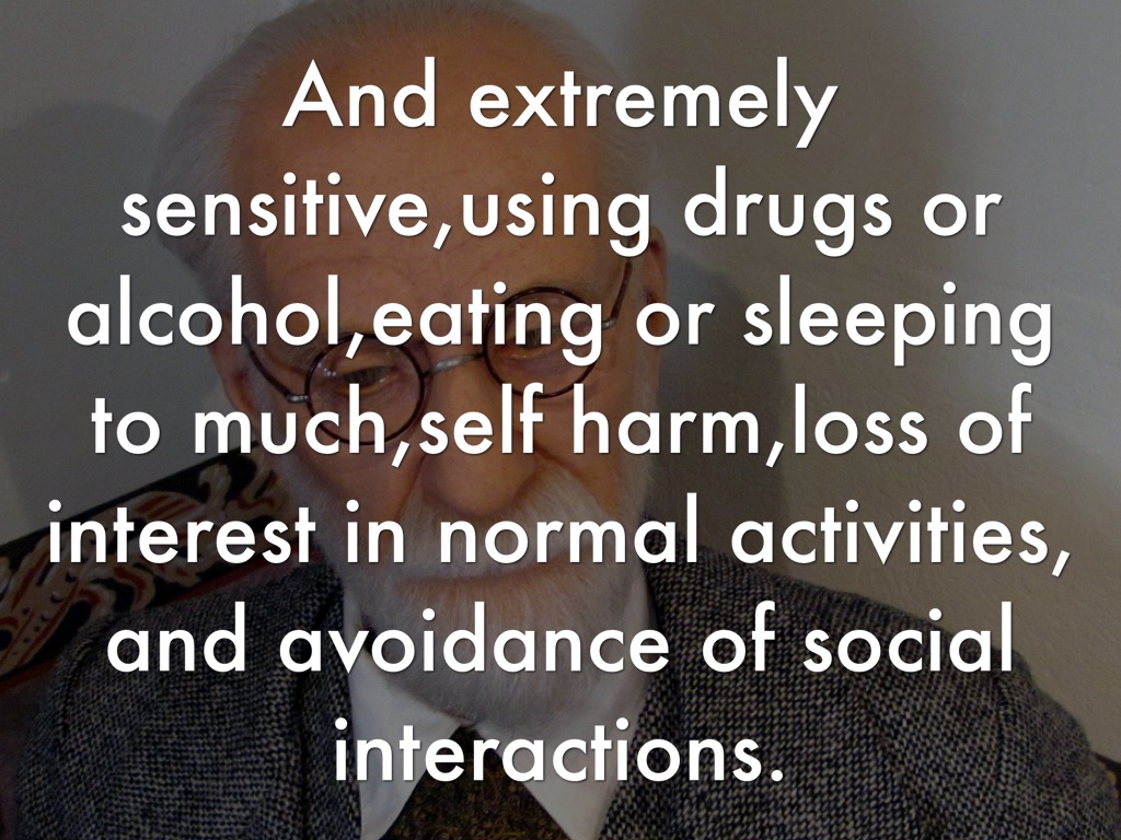 And extremely sensitive,using drugs or alcohol,eating or sleeping to much,self harm,loss of interest in normal activities, and avoidance of social interactions.