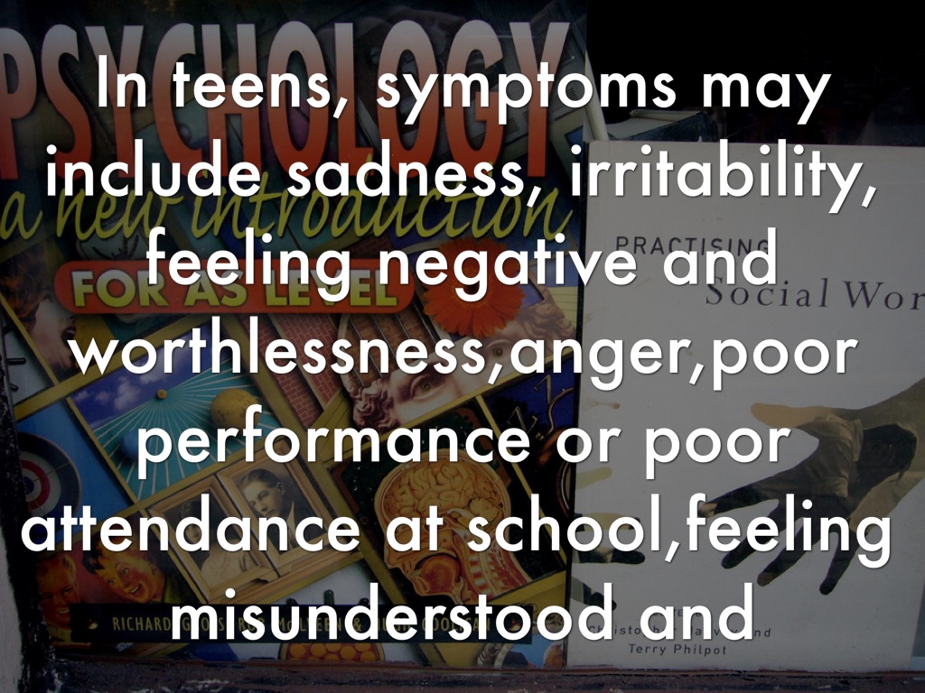 In teens, symptoms may include sadness, irritability, feeling negative and worthlessness,anger,poor performance or poor attendance at school,feeling misunderstood and