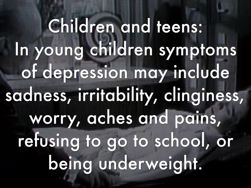 Children and teens: In young children symptoms of depression may include sadness, irritability, clinginess, worry, aches and pains, refusing to go to school, or being underweight.