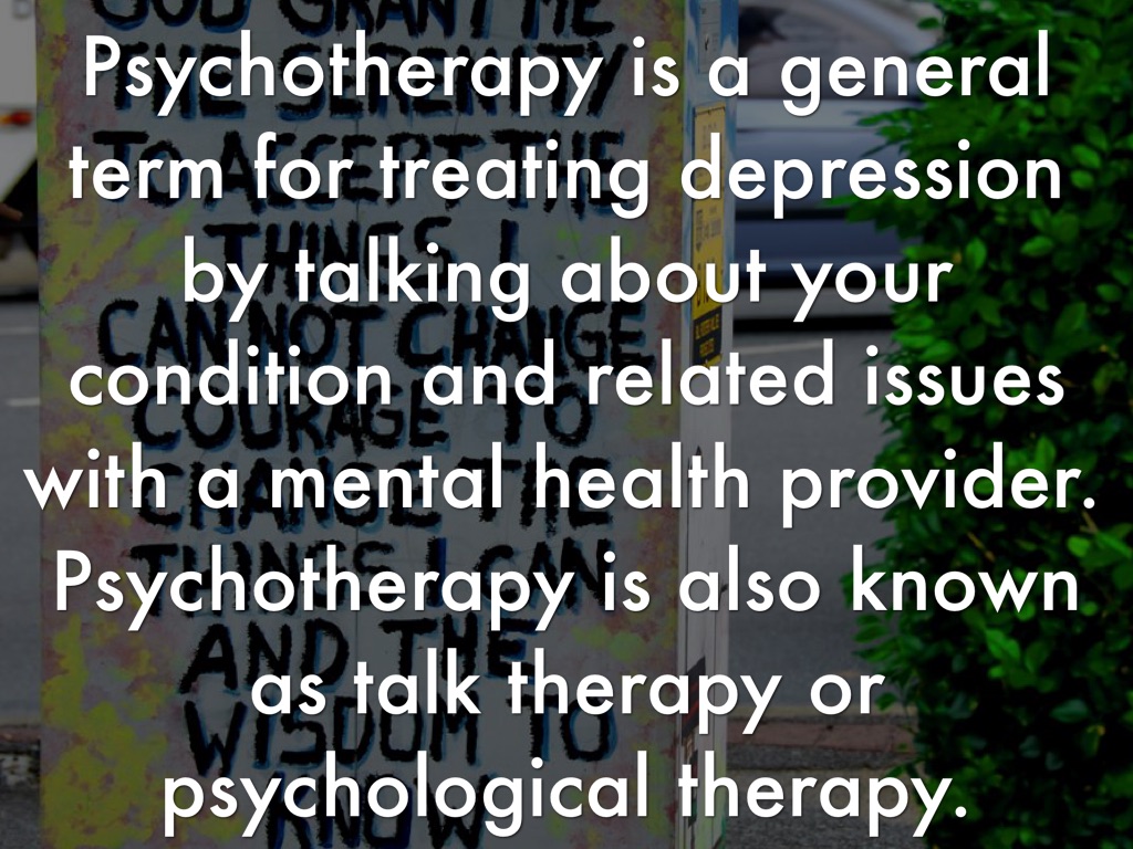 Psychotherapy is a general term for treating depression by talking about your condition and related issues with a mental health provider. Psychotherapy is also known as talk therapy or psychological therapy.