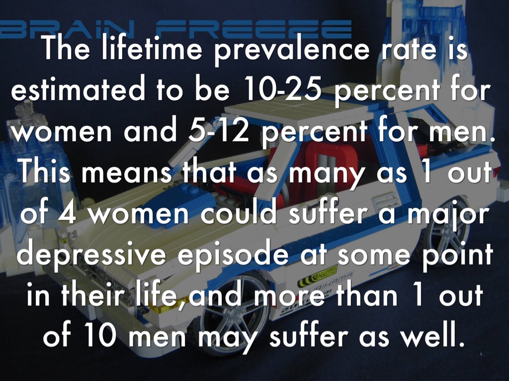 The lifetime prevalence rate is estimated to be 10-25 percent for women and 5-12 percent for men. This means that as many as 1 out of 4 women could suffer a major depressive episode at some point in their life,and more than 1 out of 10 men may suffer as well.