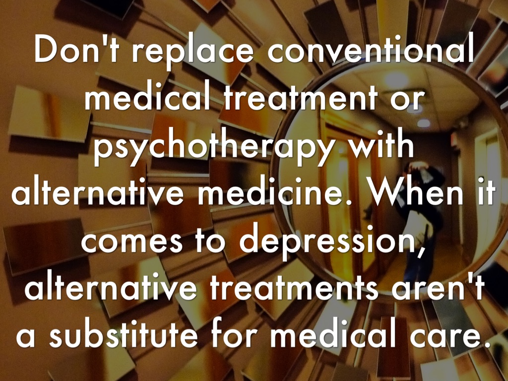 Don't replace conventional medical treatment or psychotherapy with alternative medicine. When it comes to depression, alternative treatments aren't a substitute for medical care.