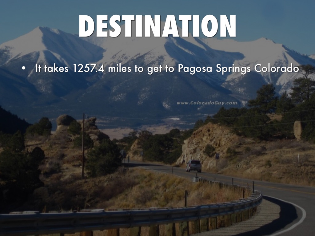 • It takes 1257.4 miles to get to Pagosa Springs Colorado