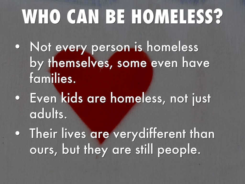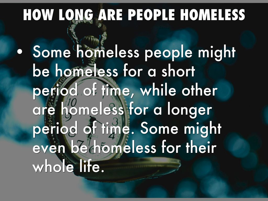 Some homeless people might be homeless for a short period of time, while other are homeless for a longer period of time. Some might even be homeless for their whole life.
