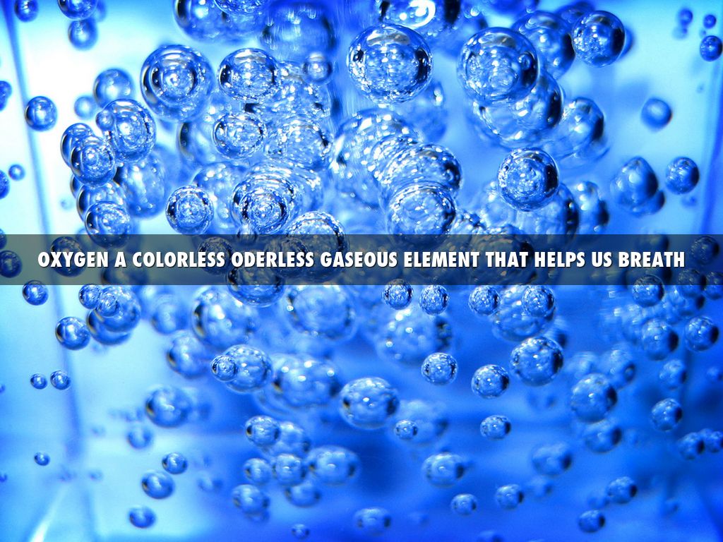 OXYGEN A COLORLESS ODERLESS GASEOUS ELEMENT THAT HELPS US BREATH
