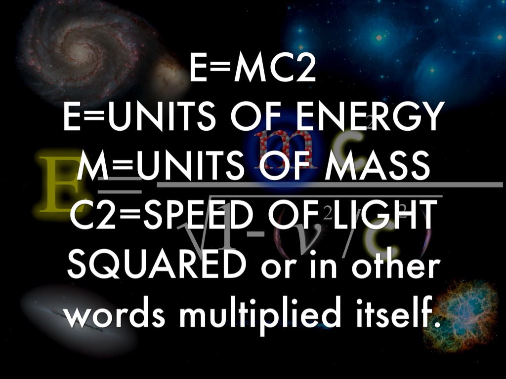 E=UNITS OF ENERGY M=UNITS OF MASS C2=SPEED OF LIGHT SQUARED or in other words multiplied itself.