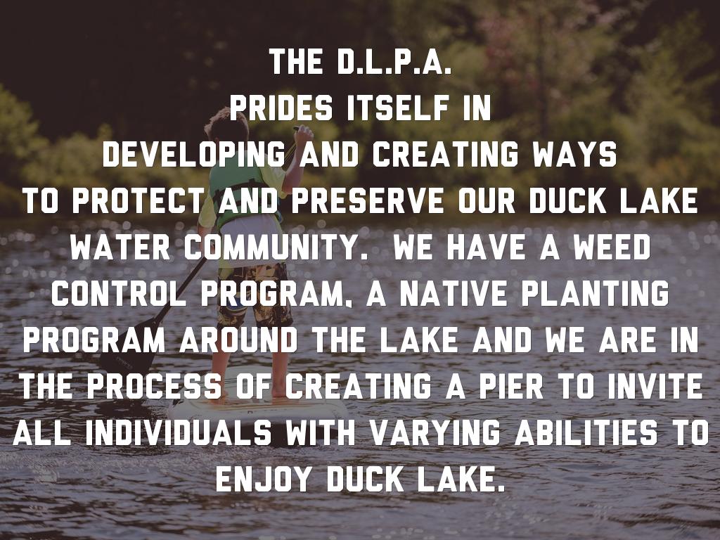Water community. We have a weed control program, a native planting program around the lake and we are in the process of creating a pier to invite all individuals with varying abilities to enjoy Duck Lake.