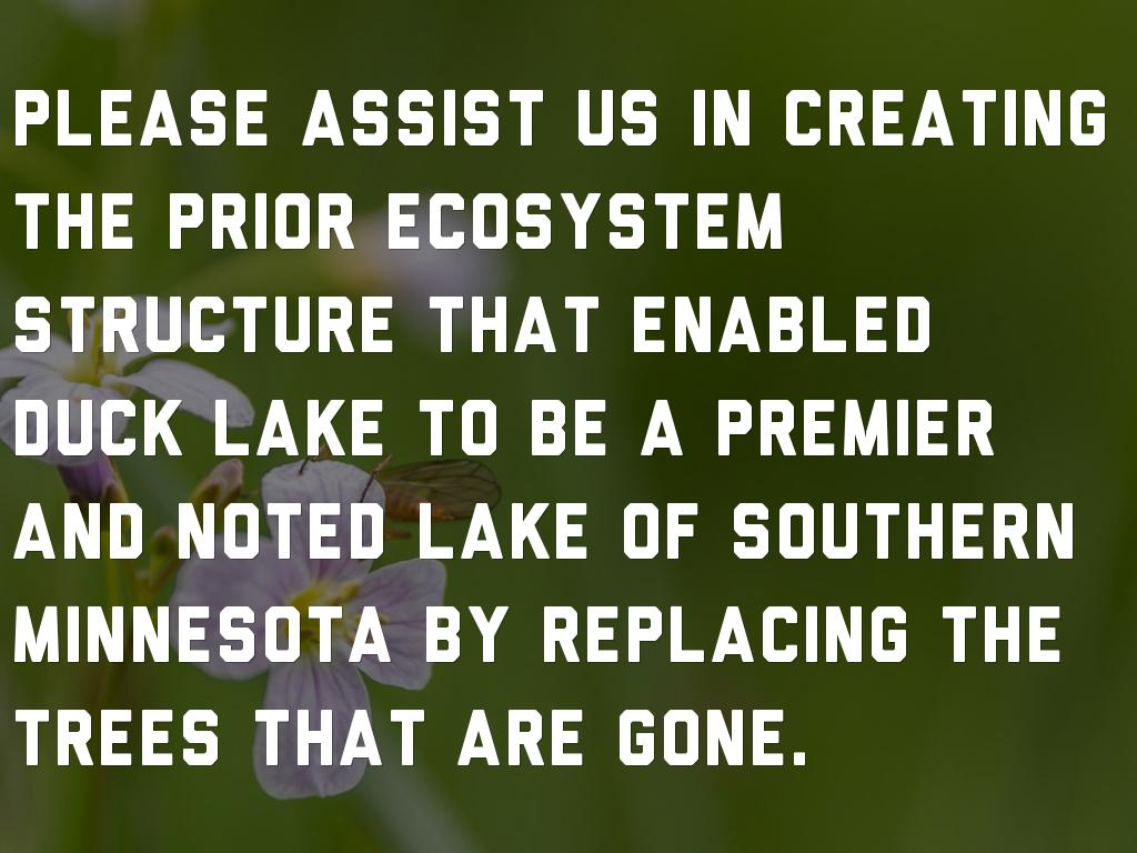 Please assist us in creating the prior ecosystem structure that enabled Duck Lake to be a premier and noted lake of Southern Minnesota by replacing the trees that are gone.
