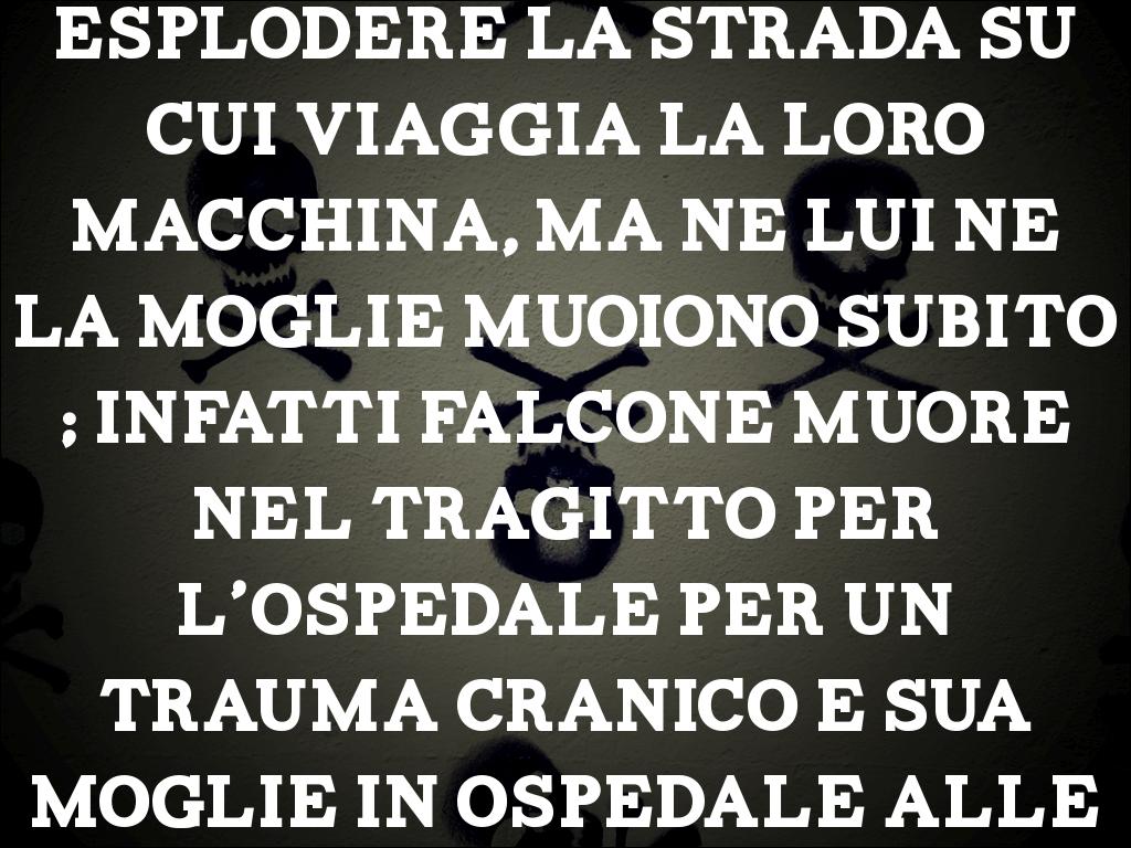 Un attentato fa esplodere la strada su cui viaggia la loro macchina, ma ne lui ne la moglie muoiono subito ; infatti Falcone muore nel tragitto per l’ospedale per un trauma cranico e sua moglie in ospedale alle 22:00.