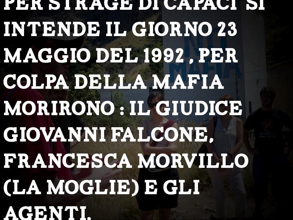 Per strage di capaci si Intende il giorno 23 maggio del 1992 , per colpa della mafia morirono : il giudice Giovanni Falcone, Francesca morvillo (la moglie) e gli agenti.