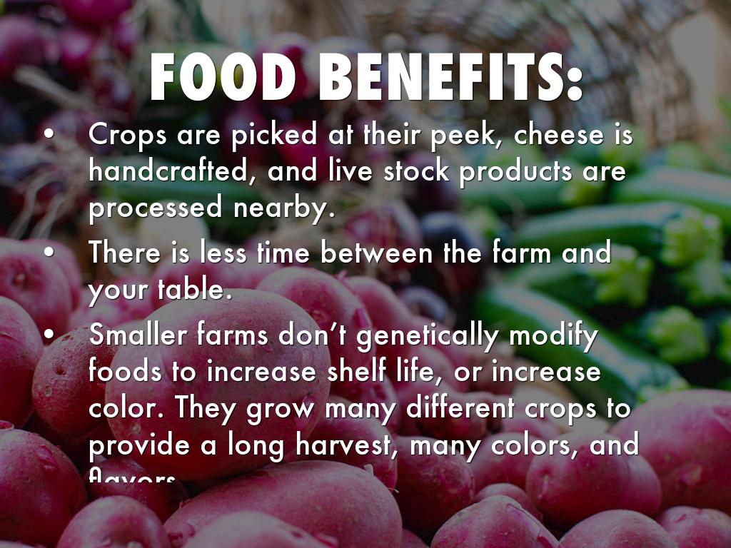 Smaller farms don’t genetically modify foods to increase shelf life, or increase color. They grow many different crops to provide a long harvest, many colors, and flavors.