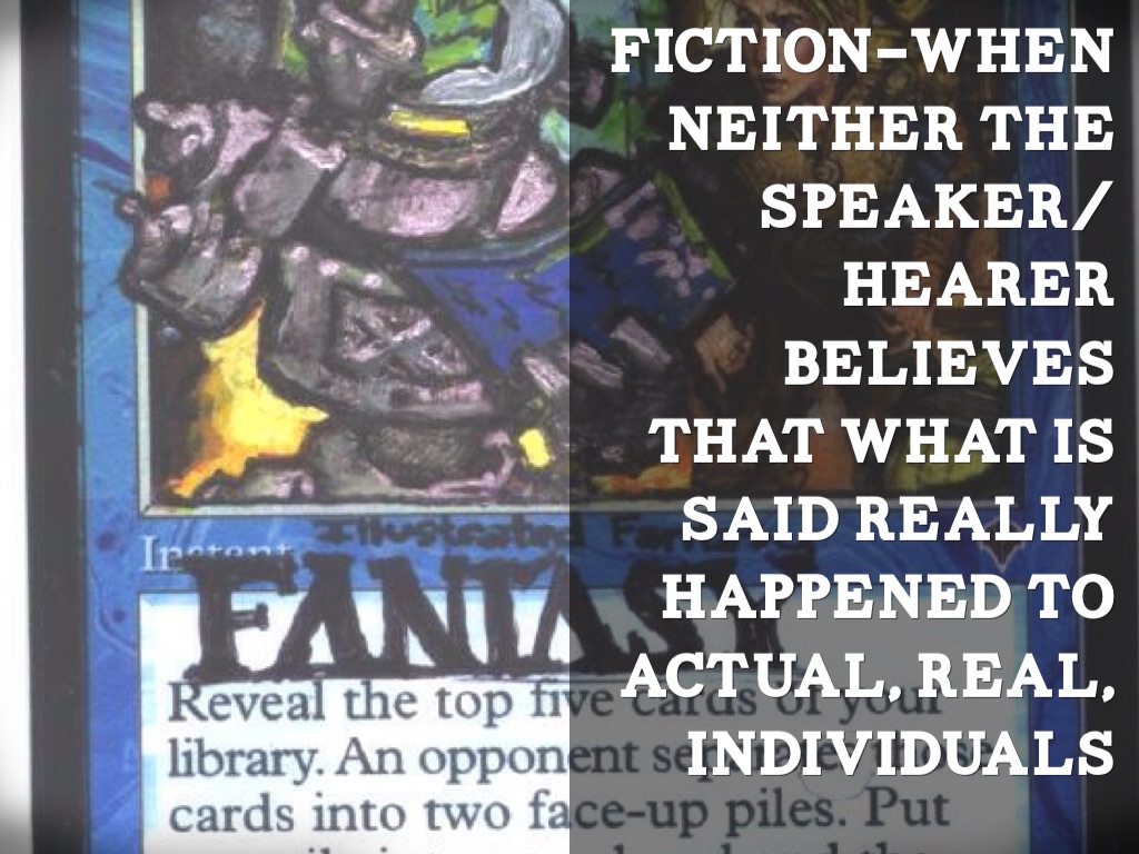Fiction-when neither the speaker/hearer believes that what is said really happened to actual, real, individuals