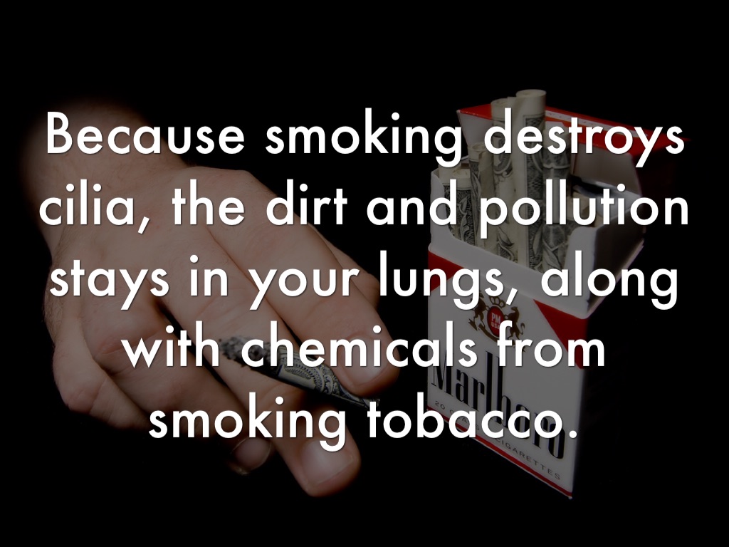 Because smoking destroys cilia, the dirt and pollution stays in your lungs, along with chemicals from smoking tobacco.