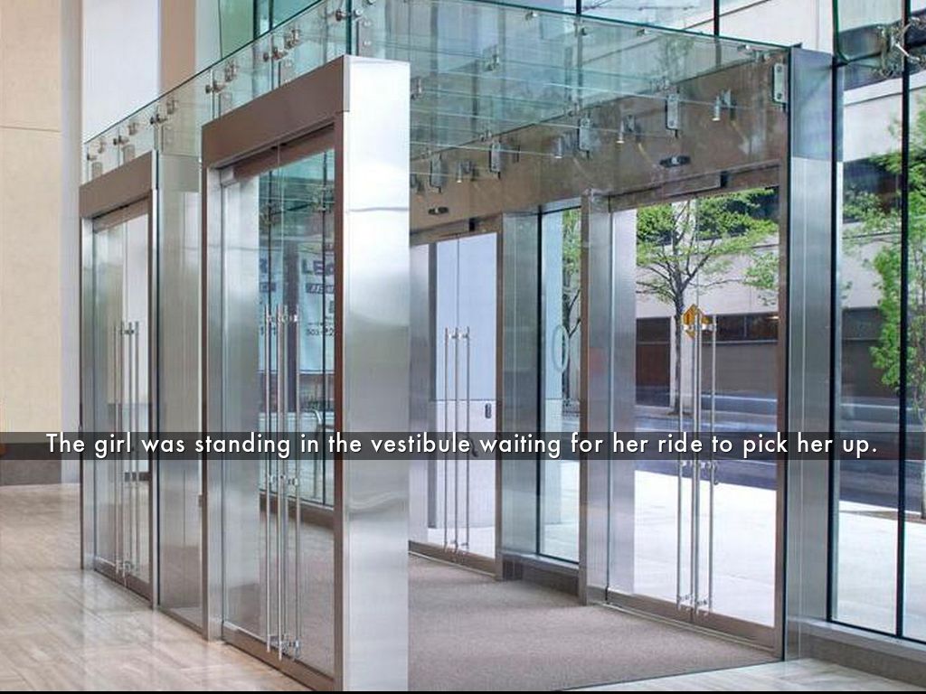 The girl was standing in the vestibule waiting for her ride to pick her up.