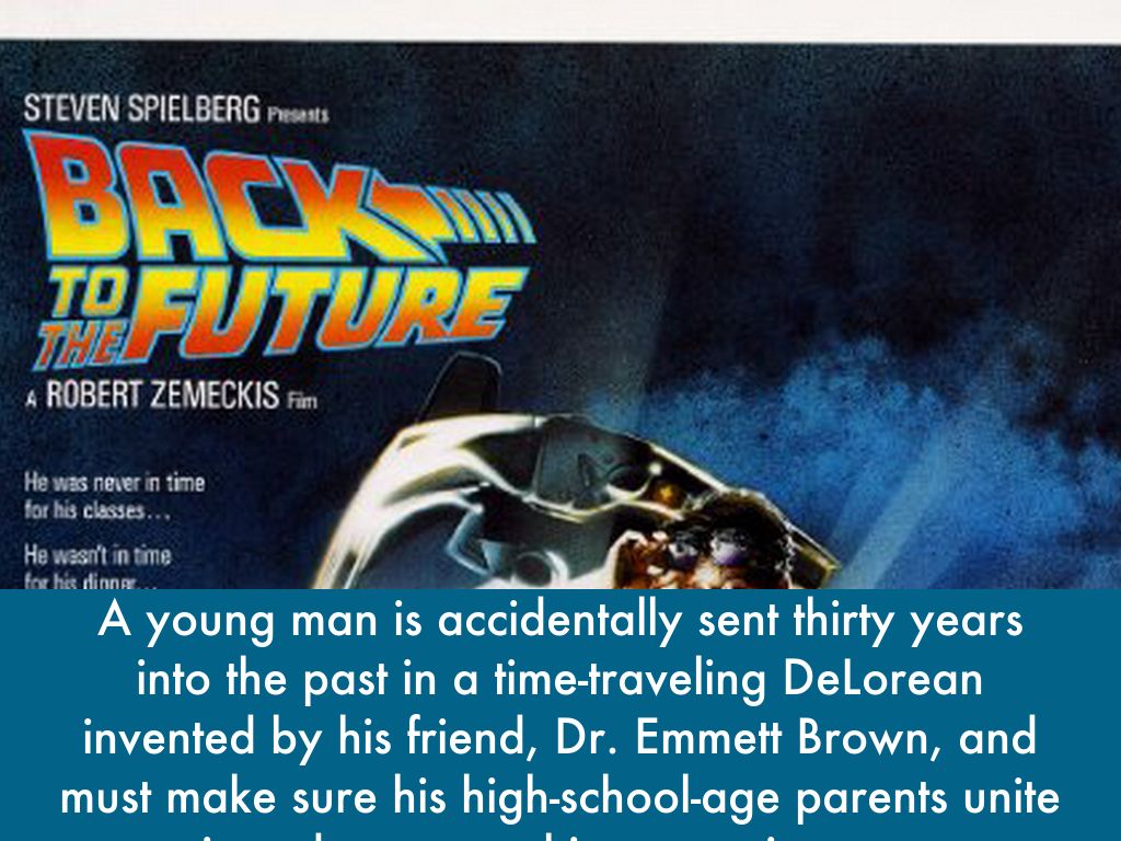 A young man is accidentally sent thirty years into the past in a time-traveling DeLorean invented by his friend, Dr. Emmett Brown, and must make sure his high-school-age parents unite in order to save his own existence.