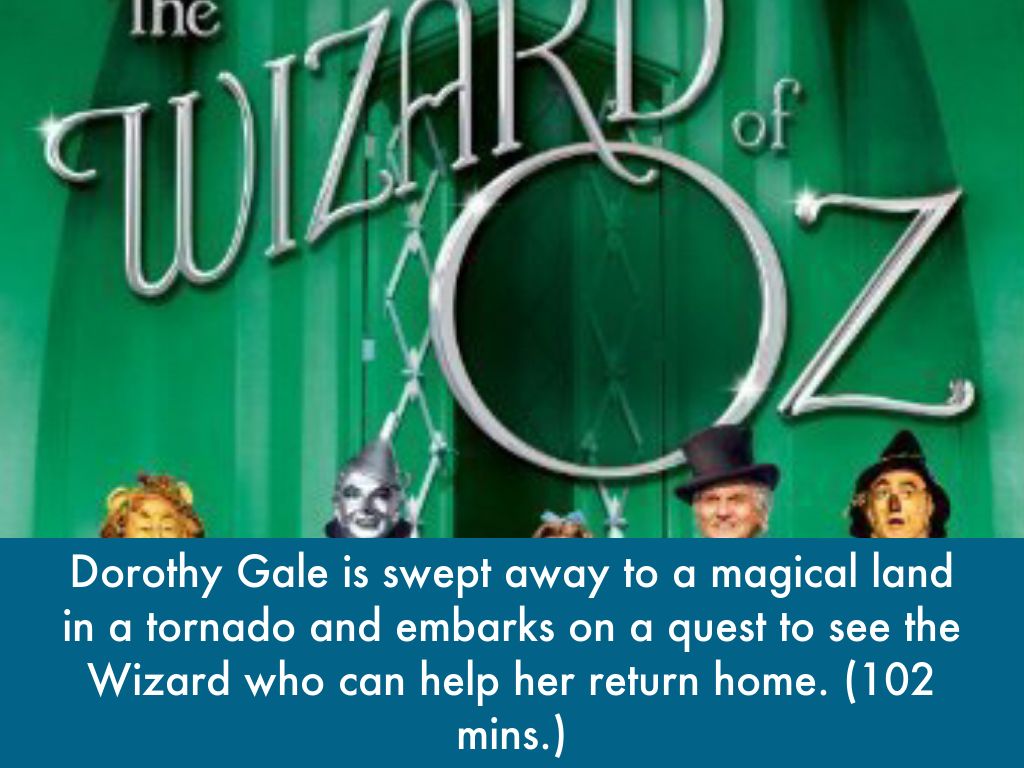 Dorothy Gale is swept away to a magical land in a tornado and embarks on a quest to see the Wizard who can help her return home. (102 mins.)